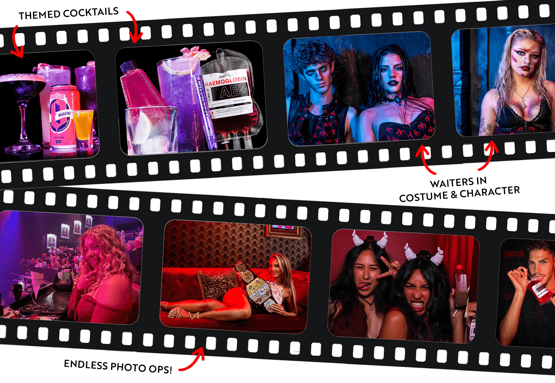 The experience doesn’t stop there. Throughout the night, you’ll find plenty of ways to indulge a little further - think expertly crafted themed cocktails, mischievously unhinged vampires serving you in full character and costume, and photo ops lurking around every corner. It’s immersive, a little chaotic, and all part of the fun.